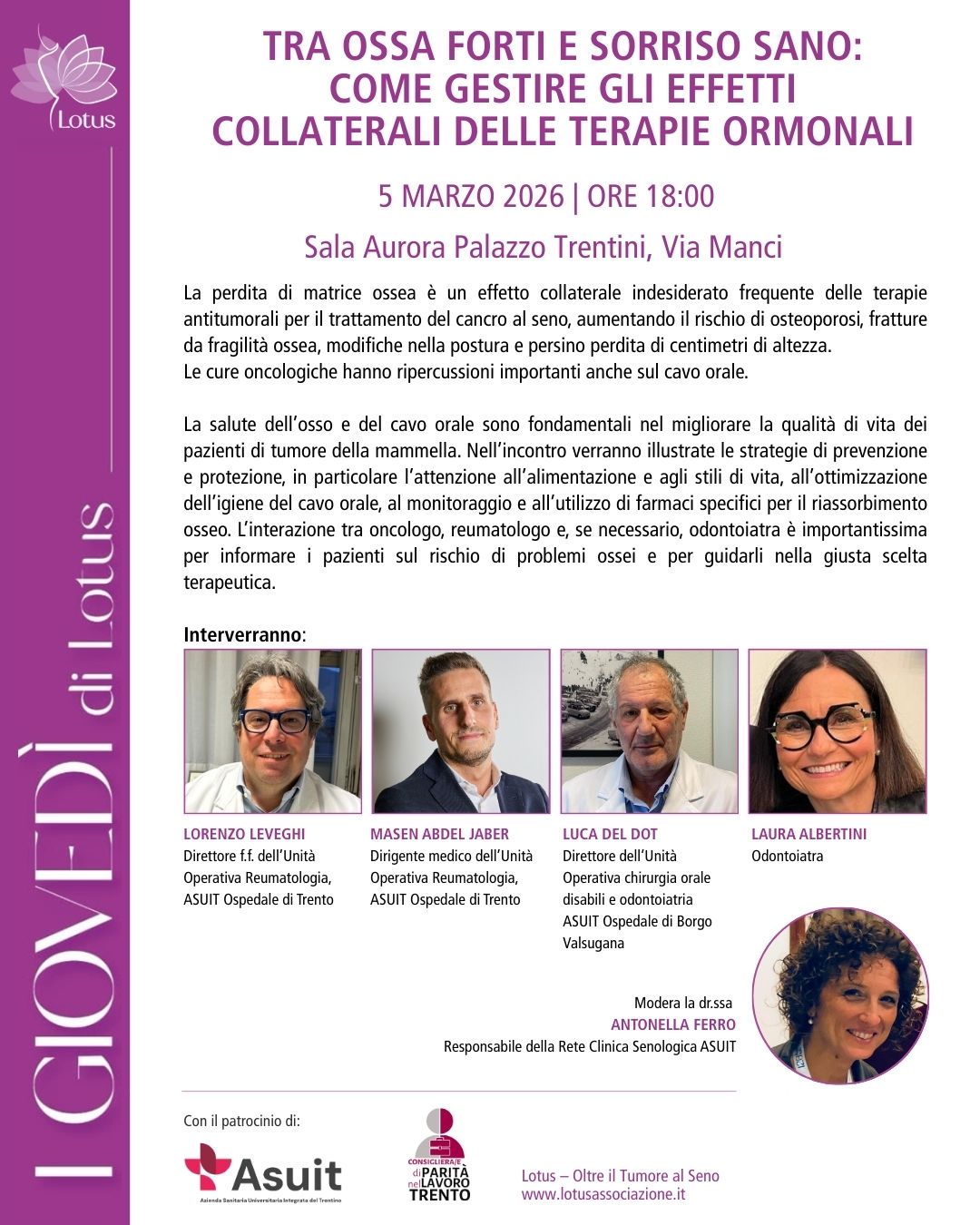 La salute dell’osso e del cavo orale sono fondamentali nel migliorare la qualità di vita dei pazienti di tumore della mammella. Nell’incontro verranno illustrate le strategie di prevenzione e protezione, in particolare l’attenzione all’alimentazione e agli stili di vita, all’ottimizzazione dell’igiene del cavo orale, al monitoraggio e all’utilizzo di farmaci specifici per il riassorbimento osseo. L’interazione tra oncologo, reumatologo e, se necessario, odontoiatra è importantissima per informare i pazienti sul rischio di problemi ossei e per guidarli nella giusta scelta terapeutica.