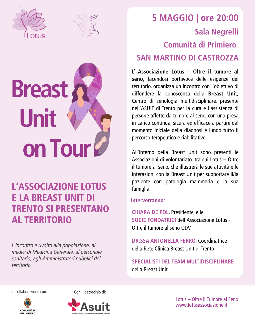 L’ Associazione Lotus – Oltre il tumore al seno, facendosi portavoce delle esigenze del territorio, organizza un incontro con l’obiettivo di diffondere la conoscenza della Breast Unit, Centro disenologia multidisciplinare, presente nell’APSS di Trento per la cura e l’assistenza di personeaffette da tumore al seno, con una presa in carico continua, sicura ed efficace a partire dalmomento iniziale della diagnosi e lungo tutto il percorso terapeutico e riabilitativo.
